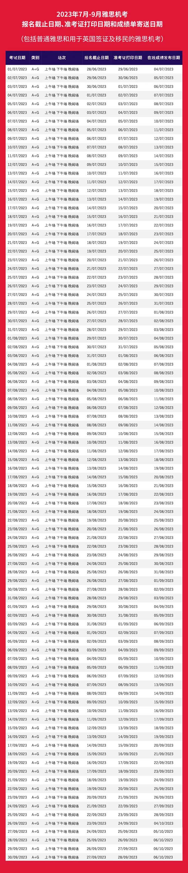 2023年7月-9月普通雅思和用于英國(guó)簽證及移民的雅思機(jī)考報(bào)名截止日期、準(zhǔn)考證打印日期和成績(jī)單寄送日期: