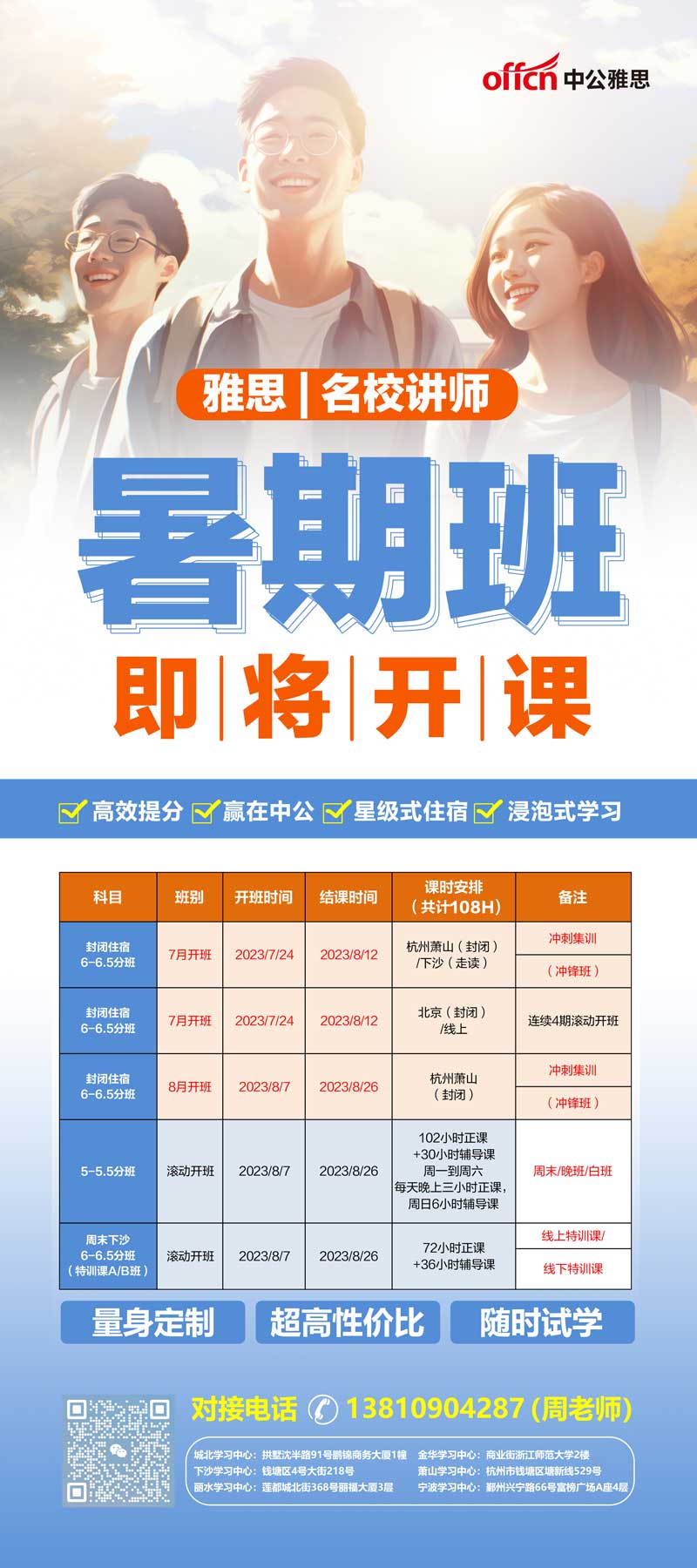 但想提高雅思分?jǐn)?shù)難度還是比較大的,如果僅憑自學(xué),更是難度驟增。在此情況下,想盡快提高分?jǐn)?shù),選擇適合的培訓(xùn)班就顯得尤為重要,下面為大家介紹7月份浙江雅思集訓(xùn)班: